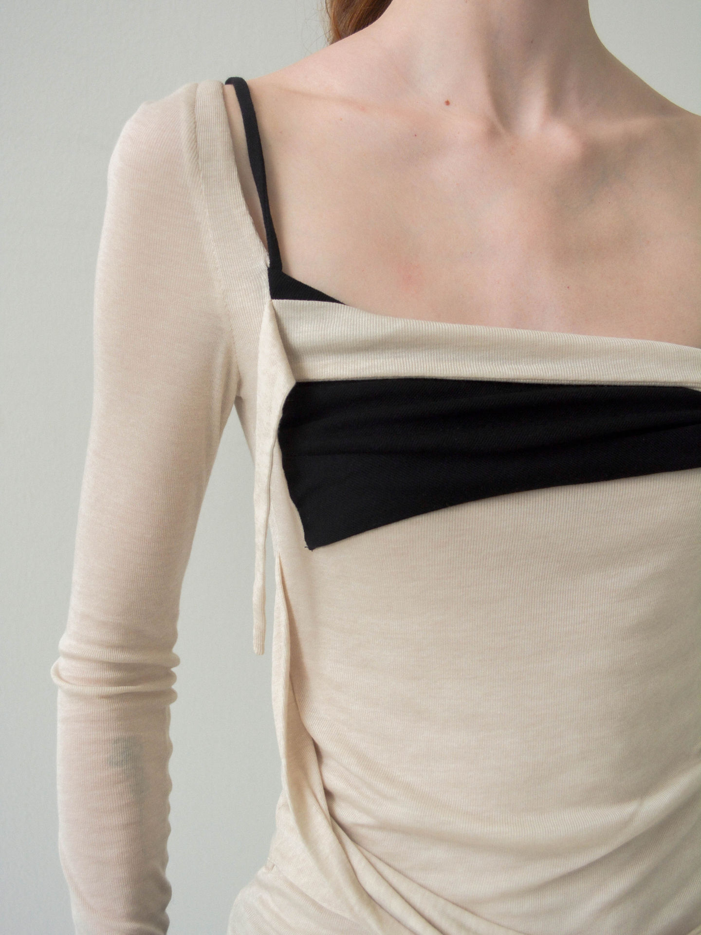 Artois Beige top is a long sleeve top with hanging straps and drape details
