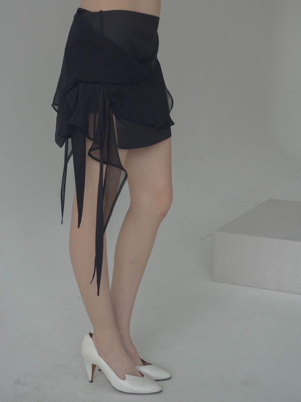 Lerra Black Short Skirt is a low-waist mini skirt featuring sculptural draping inspired by wilted flowers and panels with different texture.