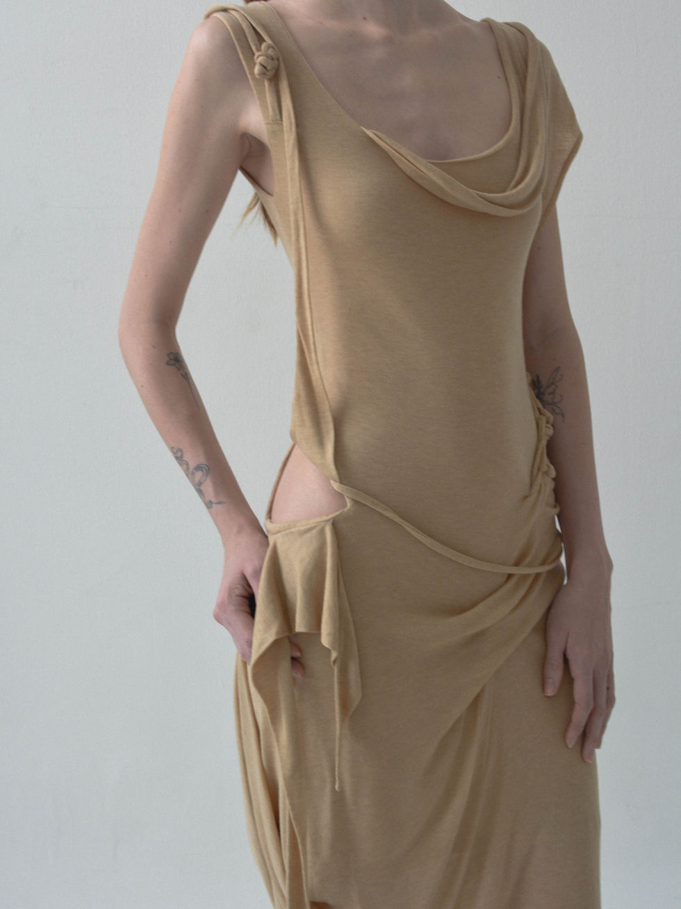 The Morph Nude Dress is a fitted jersey design featuring asymmetrical draping, cut-out, braided accents, and hanging strap details.