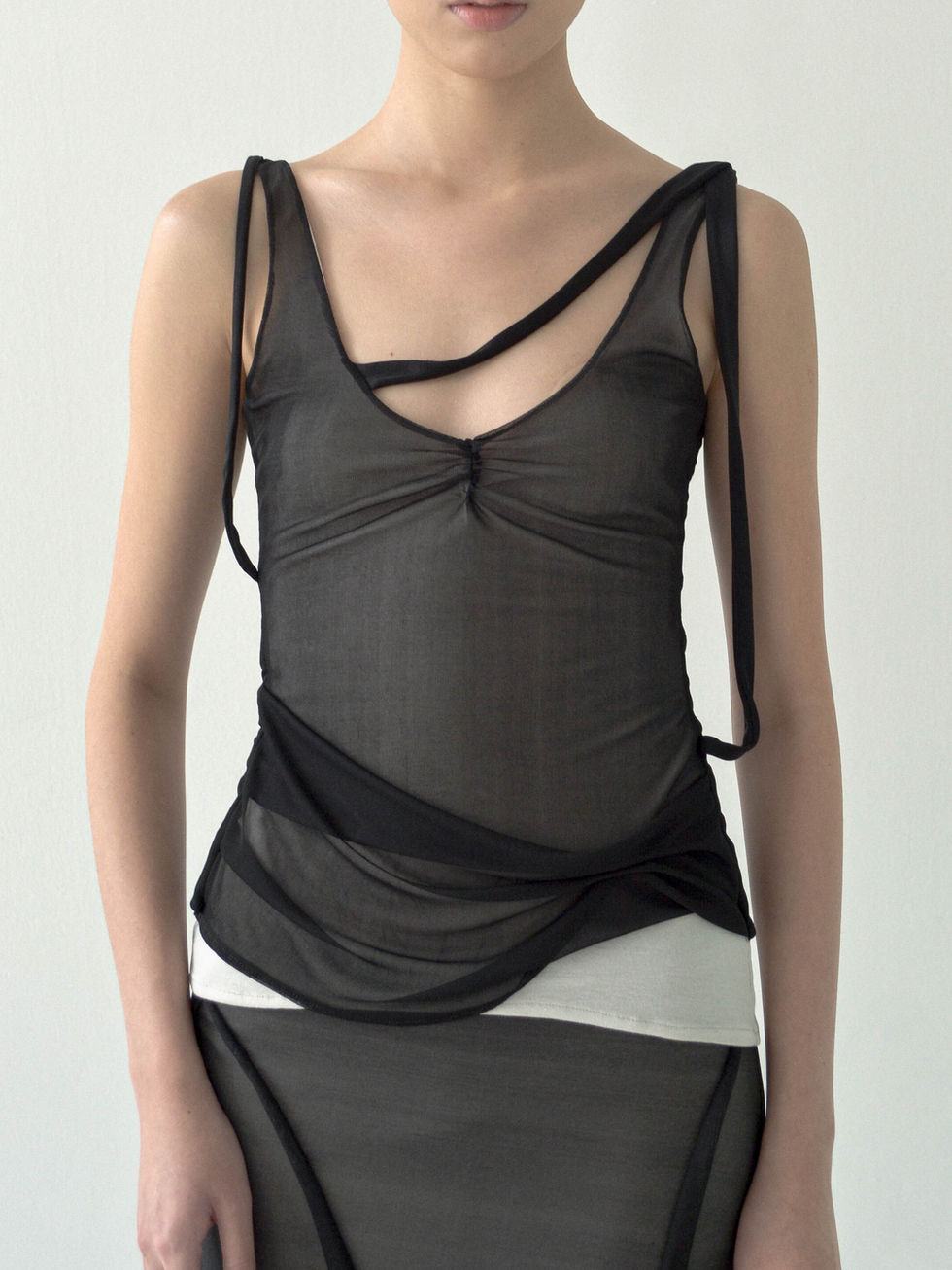 The Pans Drape Top is a double layered top with sheer and jersey materials in draped details.